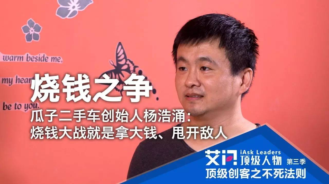 烧钱之争:29%的失败创业公司出现过这个问题。烧钱已经在各个领域被证明不是一个很好的模式,但是仍然有创业者喜欢用这种简单粗暴的形式,前赶集网创始人杨浩涌无疑是其中一员,曾为与58同城一决高下,两家纠缠十年,烧钱超过20亿人民币,2015年杨浩涌离开合并后的58赶集公司,转战互联网二手车电商市场中,建立瓜子二手车,不过在杨浩涌的引导下,大规模广告竞争已经成为行业内的主旋律。曾经落败58同城,杨浩涌再战二手车。关于烧钱怎么烧,什么时候烧,他有话说。