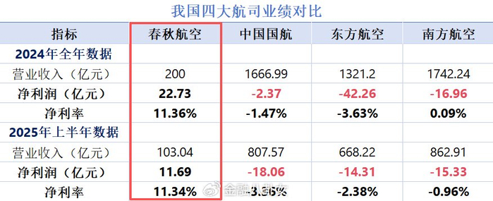 这套精打细算的玩法,从财报上就能看得一清二楚。2025 年上半年,三大航的日子有点惨:国航亏了 18 亿,南航和东航也各亏十来亿。而春秋航空呢?营收 103.04 亿元,净利润 11.69 亿元,稳稳坐在 A 股最赚钱航司的位置。