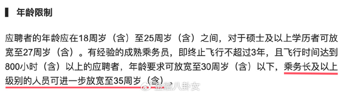 各大航司的招聘启事几乎清一色地写着“18至25岁”,能放宽到30岁就已经算“业界清流”,而首都航空那条“乘务长可放宽至35岁”的招聘,甚至都能上热搜。