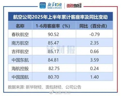 ▲2025年上半年部分航司客座率变化/ 来源:新华财经、面包财经