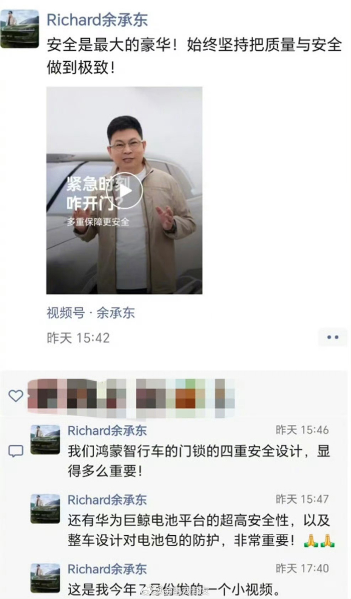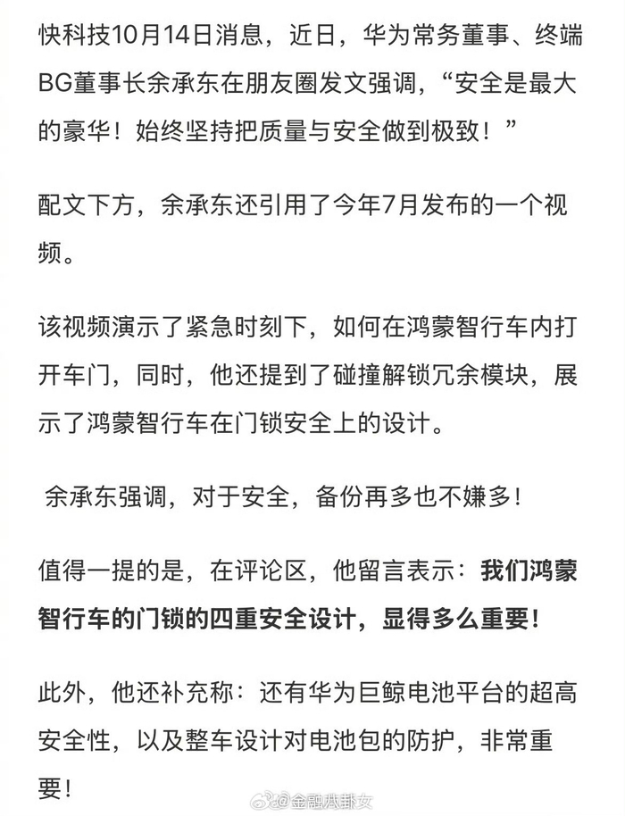 余承东演示紧急时刻咋开门,再发文强调车门锁安全