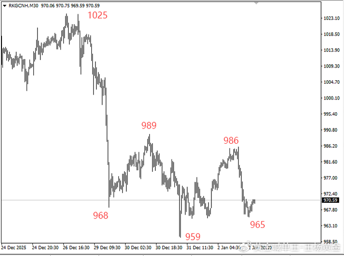 逻辑:若4274(国内金价959元/克)支撑有效,且上方4403(国内金价989元/克)阻力未被突破,黄金将继续在4274-4403(959-989元/克)区间内震荡。这种情况多因市场等待重要数据(如1月9日周五非农、CPI)或政策信号,多空暂时达成平衡。