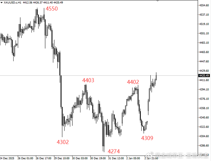 1. 趋势与支撑:黄金从4550高点回撤至4303后,形成双底结构(4302、4309),且二次回撤低点未破前低,属于典型的“回撤企稳”形态;随后反弹突破前期两个高点4404和4402,完成趋势反转的关键突破,多头结构初步确立。
