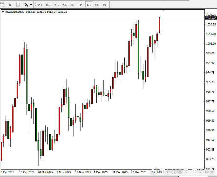 从国内黄金日线走势图来看,当前走势呈现强势多头反转形态,三连阳叠加近5个交易日6阳1阴的节奏,不仅完全覆盖12月29日大阴线的跌幅,更确认了涨势重启的信号,后市多头动能将持续释放,新高突破是核心主线。