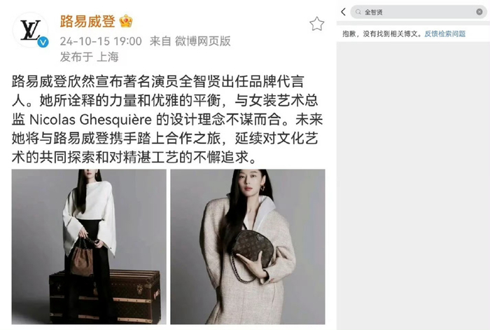 21日,网友发现路易威登官方微博也撤下全智贤相关代言内容。