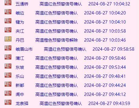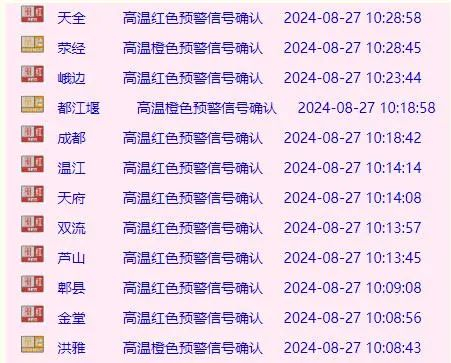 成都市气象台2024年08月27日10时00分继续发布高温红色预警信号:预计成都市武侯区、锦江区、青羊区、成华区、金牛区、高新南区、高新西区和青白江区的所有镇(街道)未来24小时内最高气温将升至37℃以上,东部新区的所有镇(街道)未来24小时内最高气温将升至40℃以上。高温时段主要出现在今日11时至19时。请注意防范。