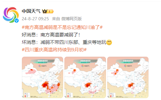 而四川盆地未来几天受暖高压持续控制,仍是高温不断。例如重庆,未来5天最高气温或将持续在40℃以上,有可能实现观测史上首次8月下旬40℃以上高温全勤。
