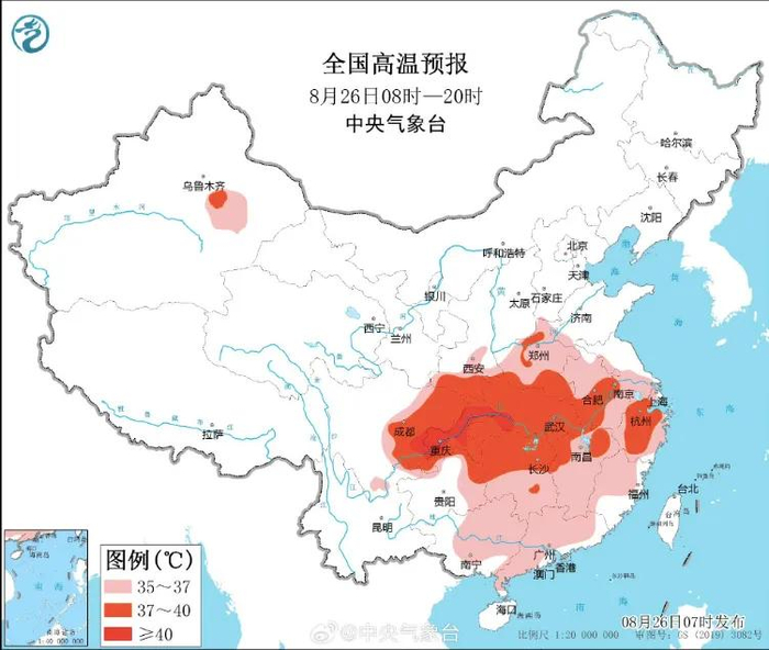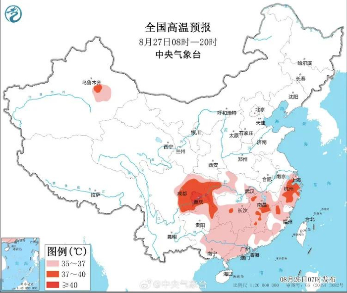 24小时内,盆地最低气温:西部25~28℃,其余地方27~29℃;最高气温:西部36~39℃,其余地方39~41℃。