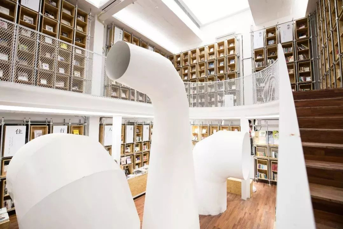 在树德设计书店中,设有贯通上下的三条管窥装置,垂直纵深、微观见宏观的管窥装置,可以从一楼看到二楼,从二楼看到一楼,让空间与空间得到联通。