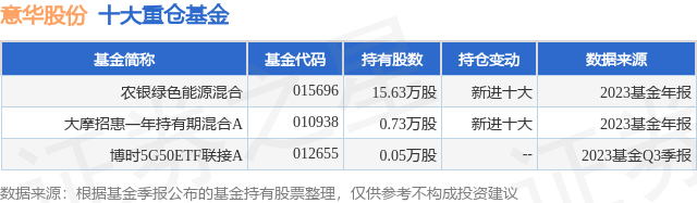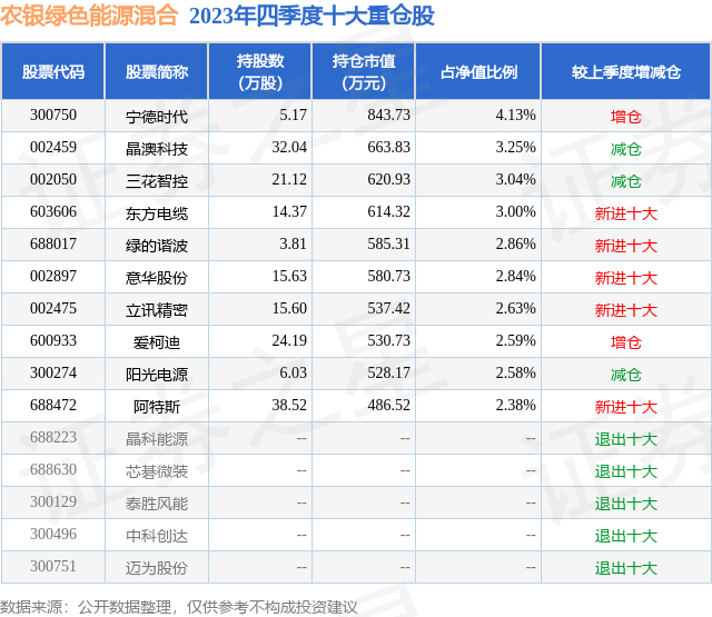 根据2023基金年报公募基金重仓股数据,重仓该股的公募基金共2家,其中持有数量最多的公募基金为农银绿色能源混合。农银绿色能源混合目前规模为2.05亿元,最新净值0.7126(3月26日),较上一交易日上涨1.15%,近一年下跌19.57%。该公募基金现任基金经理为邢军亮。邢军亮在任的基金产品包括:农银行业轮动混合A,管理时间为2021年7月15日至今,期间收益率为-3.08%;农银新能源主题A,管理时间为2021年11月3日至今,期间收益率为-53.17%;