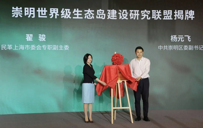 崇明世界级生态岛建设研究联盟揭牌现场由民革上海市委会副主委翟骏和中共崇明区委副书记杨元飞在会上共同揭牌的崇明世界级生态岛建设研究联盟,是民革市委会和中共崇明区委联合发起的研究机构,成员包括高校、科研院所等,将打造一个高效、协同、创新的智库合作平台。