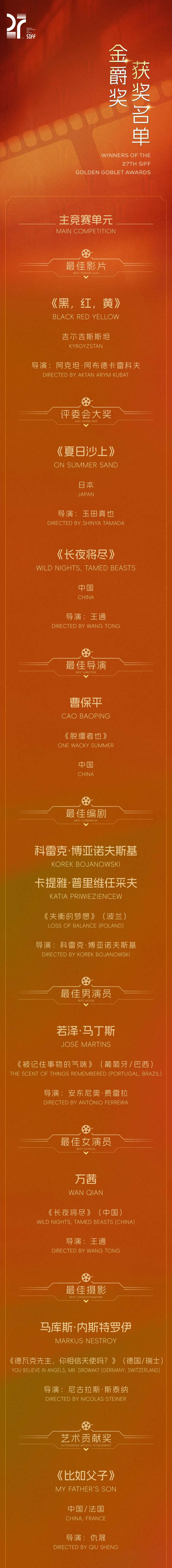 6月21日晚,第27届上海国际电影节金爵奖各单元赛果揭晓,43岁中国女演员万茜凭借电影《长夜将尽》获得主竞赛单元最佳女演员。此外,曹保平凭由成都煅影炼金影业有限公司联合出品的《脱缰者也》获得最佳导演奖。