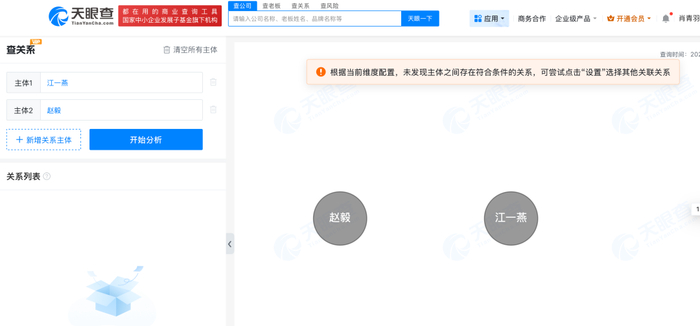 天眼查关系信息显示,江一燕与赵毅无商业关联。