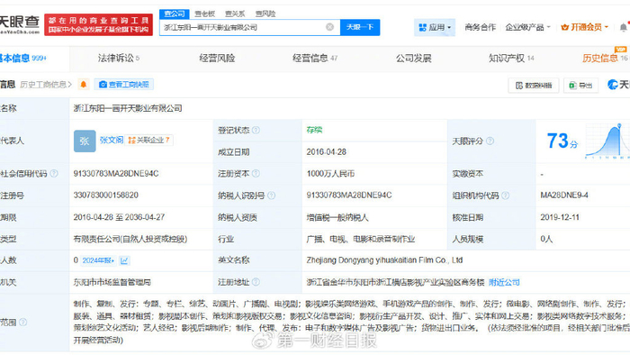 近日,天眼查天眼风险信息显示,近日,浙江东阳一画开天影业有限公司新增一则股权冻结信息,被执行人为演员张翰,冻结股权数额165万人民币,冻结期限为3年,执行法院为上海市浦东新区人民法院。