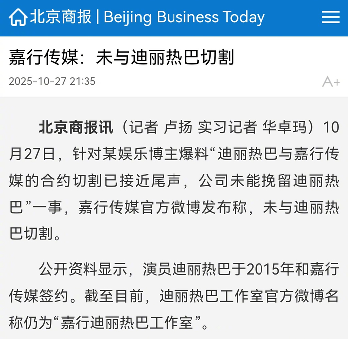 公开资料显示,演员迪丽热巴于2015年和嘉行传媒签约。截至目前,迪丽热巴工作室官方微博名称仍为“嘉行迪丽热巴工作室”。(北京商报记者 卢扬 实习记者 华卓玛 编辑 汪乃馨)