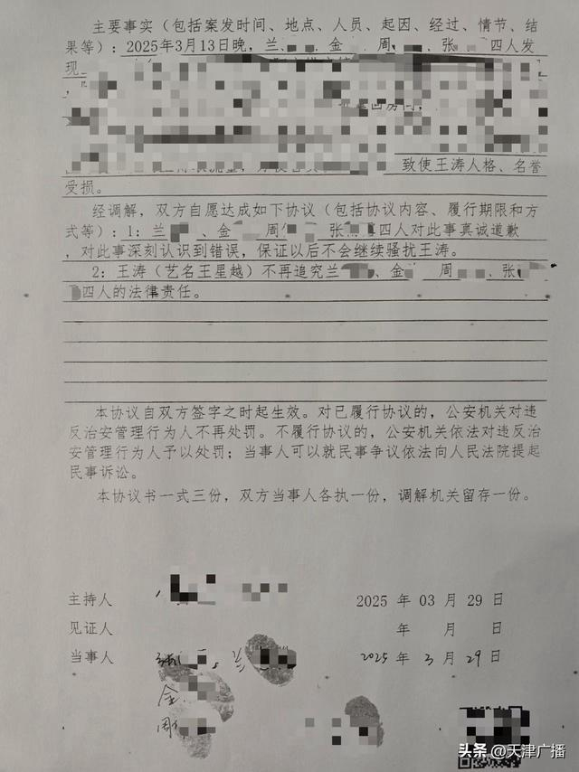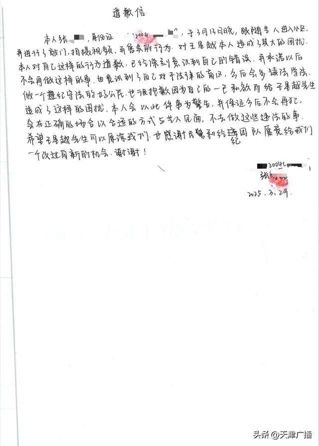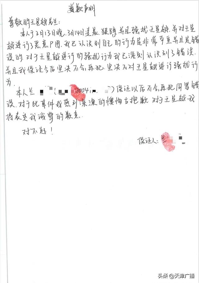 4月5日,据@王星越official : 近日,针对近期4名不明身份人员跟至艺人住所并偷拍视频的严重侵权行为,已在第一时间报警处理。警方受理后认定4人行为致使艺人人格、名誉受损,应予以追究法律责任。鉴于不明身份人员中存在未成年人,且已深刻认识到自己的错误并主动书写了道歉信,公司和艺人综合考虑后决定予以谅解,在公安机关的调解下已达成调解协议。希望以此为警示,共同维护良好的公共秩序和网络环境。