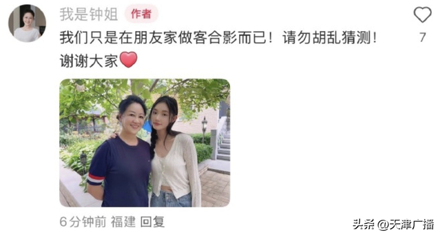 网友发现“我是钟姐”在该贴下方回复网友评论:“我们只是在朋友家做客合影而已!请勿胡乱猜测!谢谢大家。”