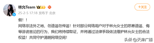 林允工作室也发文辟谣:“假!!网络非法外之地,勿造谣勿传谣!针对部分网络用户对于林允女士的恶意造谣、侮辱诽谤言论的行为,我们将持续取证,并将通过法律手段依法维护林允女士的合法权益!共同守护清朗网络空间!”