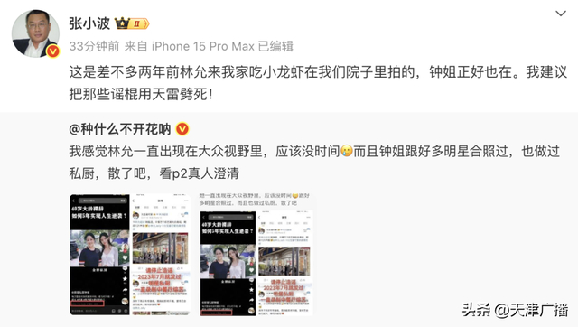 随后,北京凤凰联动文化总裁张小波发文回应:“这是两年前林允来他家吃龙虾时候拍的照片,并没有怀孕,当时钟姐也在。”