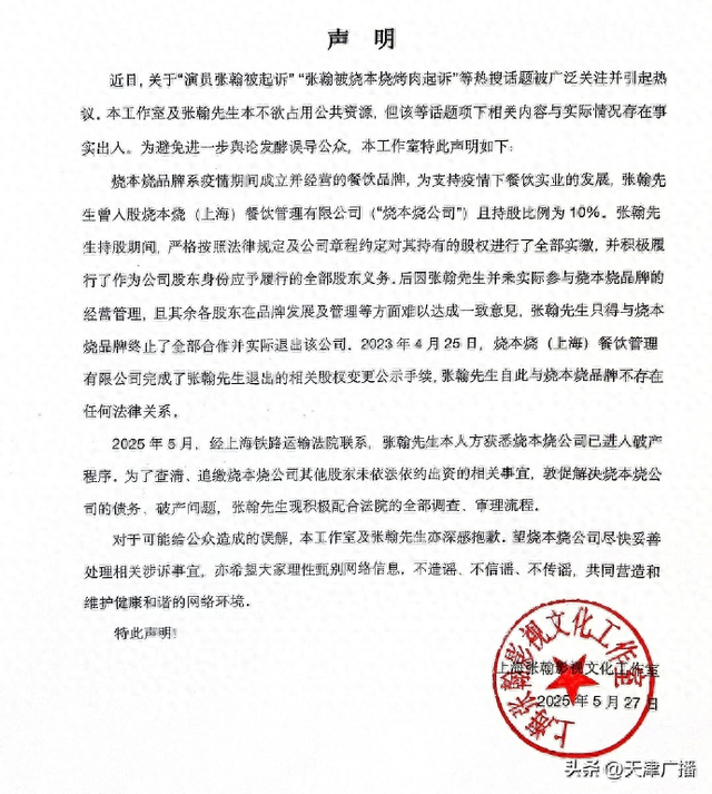 27日,话题“演员张瀚被起诉”登上微博热搜榜,引发热议。张翰工作室发布严正声明:与烧本烧品牌不存在任何法律关系。