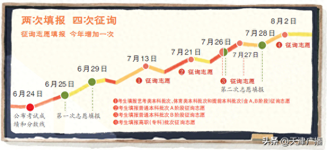 【增加一次征询志愿填报】预计今年高考成绩和分数线于6月24日公布。今年我市实行两次填报、四次征询的志愿填报方式,比以往增加了一次征询志愿填报时间。