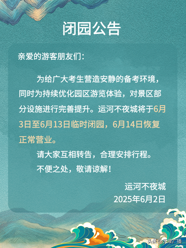 【运河不夜城,临时闭园】2日,天津武清运河不夜城发布闭园公告。运河不夜城将于6月3日至6月13日临时闭园,6月14日恢复正常营业。
