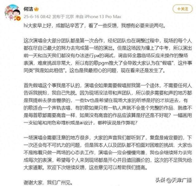 6月16日,@何洁 发长文回应假唱争议:“因为撞上了中考,所以演出前一天和当天我们都没有办法进行pa的调试,调音师全靠临场反应来操作的整场表演,难度挑战非常大,所以有的歌pqm推大了会导致大家认为在‘假唱’,这件事同类‘我是如此相信’。这也是我最担心的问题,现在看来还是发生了。首先假唱这个事我是不认的,演唱会如果需要假唱那我第一个退休,不需要任何人告诉我脱粉,我自己先脱。”
