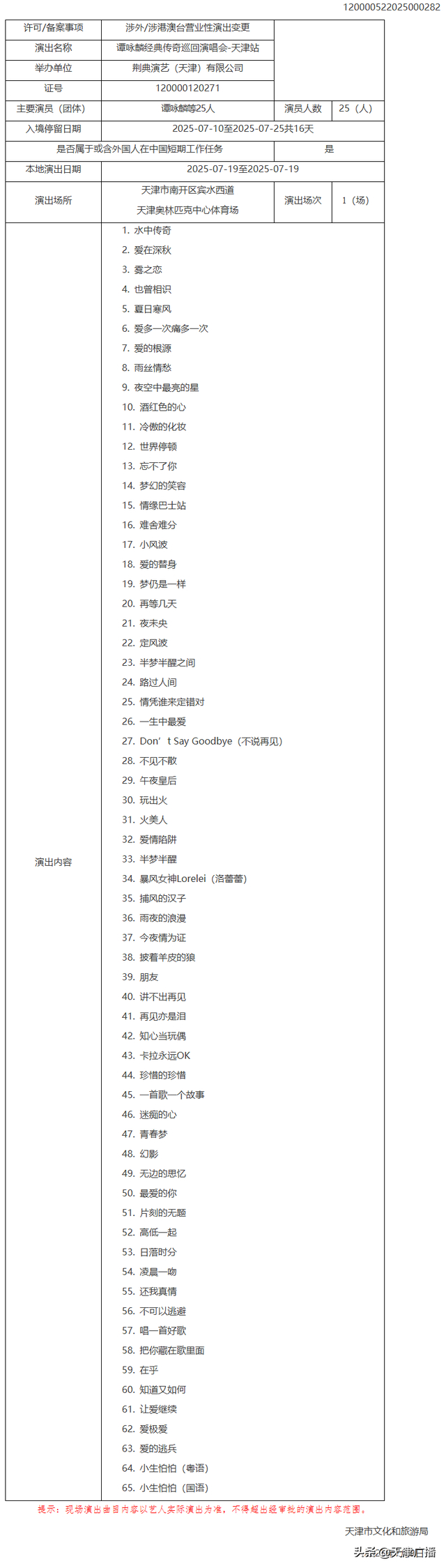 近日,天津市文旅局发布《谭咏麟经典传奇巡回演唱会-天津站》审批公示。详见下图↓