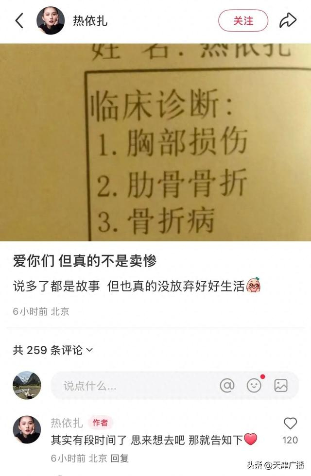 【演员热依扎晒出临床诊断病例】8月24日凌晨,演员热依扎在社交媒体平台发文:爱你们,但真的不是卖惨,说多了都是故事,但也真的没放弃好好生活。