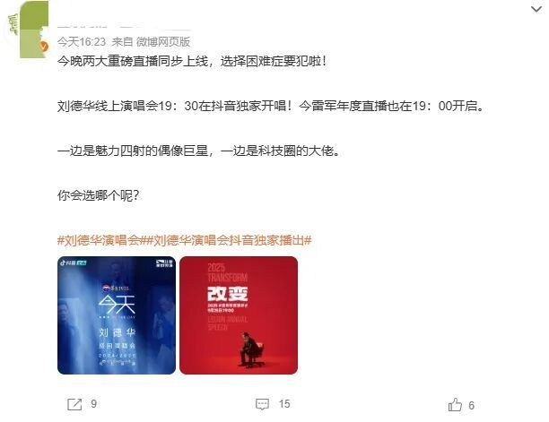 “是看雷军还是看刘德华?”两大“顶流”男子的意外碰撞让爱赶热闹的网友犯难了,有人提到,先看雷军直播,毕竟刘德华演唱会可以重播。但有人坚决拥护“从光里走来”的刘德华,“我偶像上次创造了3.5亿人在线观看演唱会的记录,今天破纪录的功劳里,绝对不能少了我!”