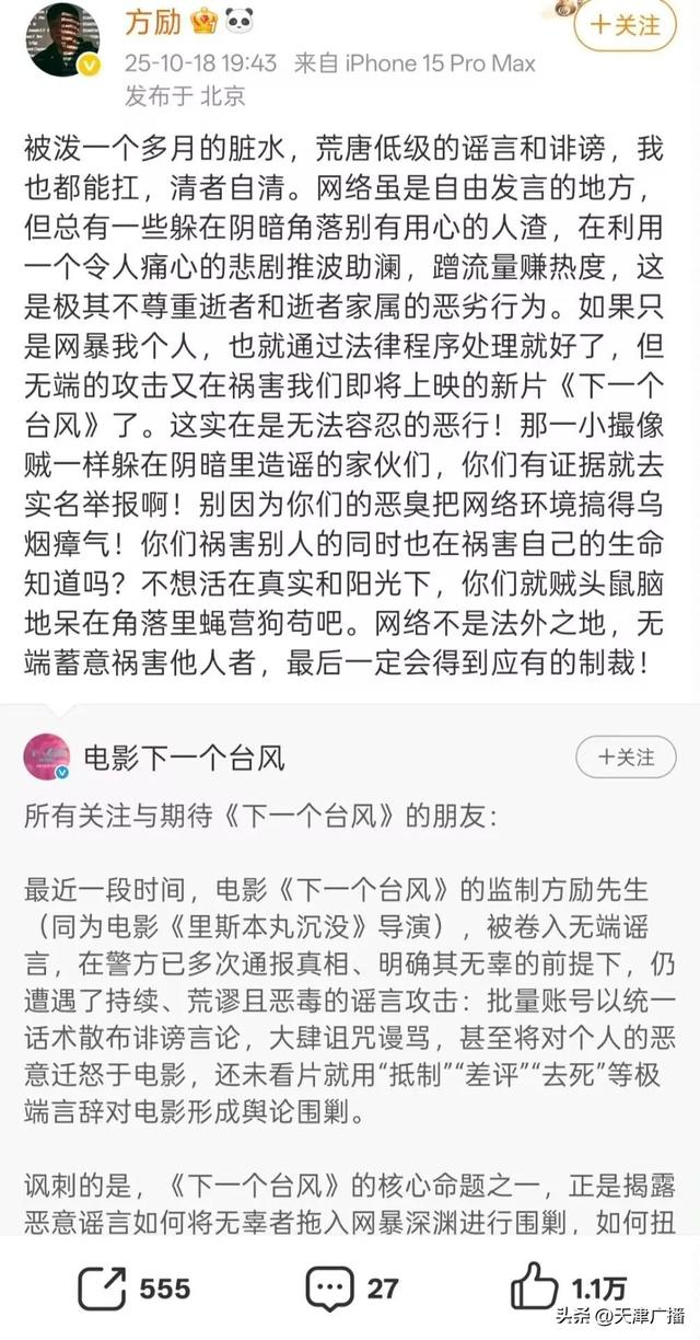 10月18日,方励通过个人社交账号发文称,无端的攻击又在祸害他们即将上映的新片《下一个台风》,实在无法容忍。同日,电影《下一个台风》官方账号也发文称,最近一段时间,电影监制方励被卷入无端谣言,在警方已多次通报真相、明确其无辜的前提下,仍遭遇了持续、荒谬且恶毒的谣言攻击,批量账号以统一话术散布诽谤言论,大肆诅咒谩骂,甚至将对个人的恶意迁怒于电影,还未看片就用“抵制”“差评”“去死”等极端言辞对电影形成舆论围剿。电影《下一个台风》将坚持在10月25日全国公映,绝不退缩。