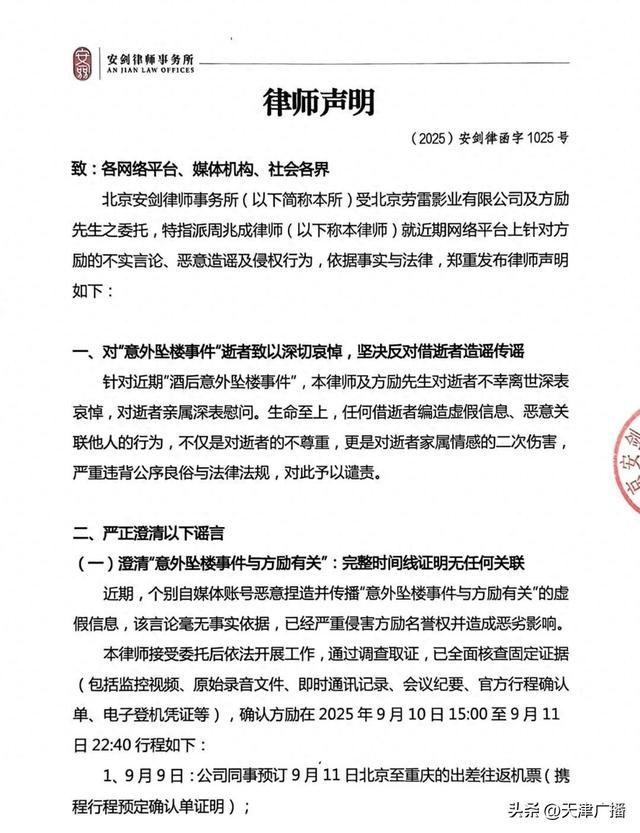 声明中就“于朦胧意外坠楼事件与方励有关”的传言回应称,近期,个别自媒体账号恶意捏造并传播这一虚假信息,毫无事实依据,已严重侵害方励名誉权并造成恶劣影响。律师接受委托后依法开展工作,通过调查取证,已全面核查固定证据(包括监控视频、原始录音文件、即时通讯记录、会议纪要、官方行程确认单、电子登机凭证等),确认了方励在2025年9月10日15:00至9月11日22:40的行程。足以证明方励与该事件毫无关联,相关谣言纯属恶意杜撰,恳请公众切勿轻信。