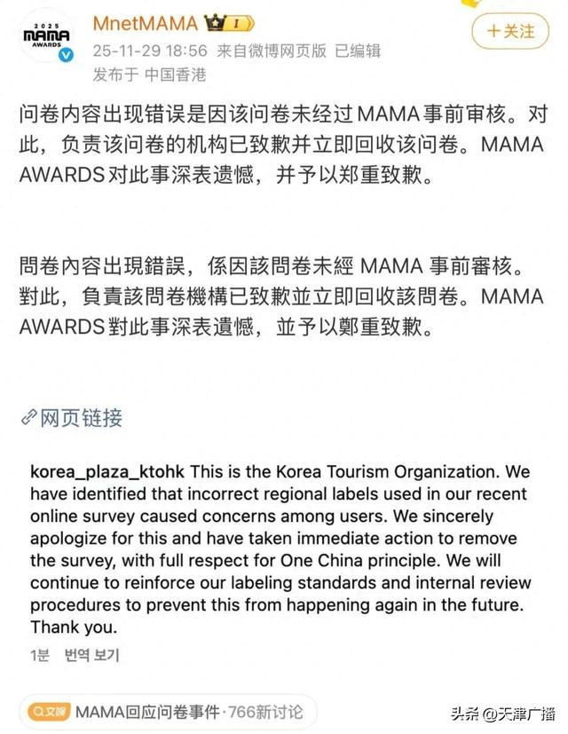 今日(11月29日),2025Mnet亚洲音乐颁奖礼(MAMA)在微博致歉: