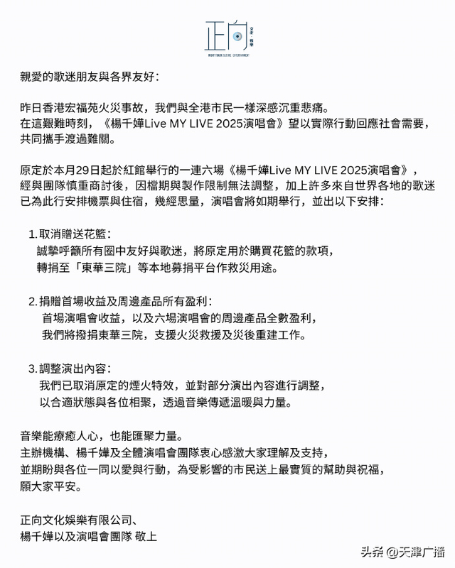 11月27日,正向文化娱乐发布公告,内容包括:杨千嬅呼吁将花篮钱转作救灾、捐赠首场收益及周边产品所有盈利、取消原定的烟火特效,并对部分演出内容进行调整。全文如下: