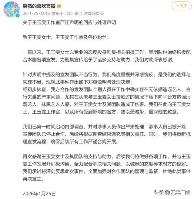 2026年开年,剧集《突然的喜欢》掀起追剧热潮,却在宣发上翻车。1月25日凌晨,王玉雯工作室全平台发布严正声明,称王玉雯参演剧集宣发团队行为不当,停止该剧一切宣传。对此,剧方回应并致歉,称已开除涉事人员。