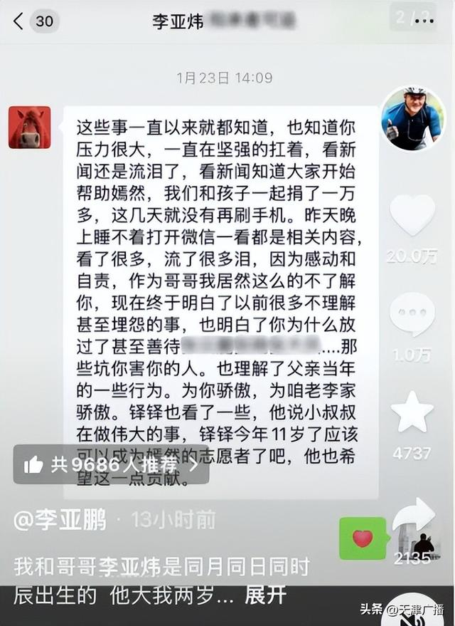 【李亚鹏发声:哭了】2月26日,李亚鹏在抖音发出与李亚炜于1989年拍摄的合影,以及李亚炜给他发来微信的截图:被哥哥短信看哭了!
