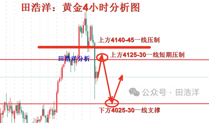 从4小时分析来看,上方我们关注4125-30一线压制,重点关注4140-45一线压制,下方关注4025-30一线支撑,操作上反弹做空为主,中间位置尽量等待观望为主,具体操作策略我会在盘中提示,及时关注。