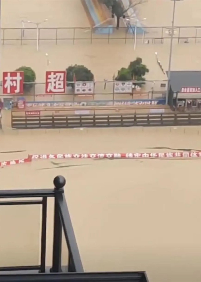 远处是被淹后的村超足球场。视频截图据极目新闻报道,当地多位网友拍摄的视频显示,24日上午,榕江县城部分区域进水被淹。据新闻晨报消息,洪水在十分钟内就淹没了村超足球场。