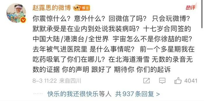 银河酷娱立刻发出声明进行回应,强调公司“坚持以她本人的意愿为第一考虑,积极对外协调各项事务”,希望能“与艺人继续携手同行,共同面对、解决一切问题”。赵露思则在评论中发出八连问:“你震惊什么?意外什么?回微信了吗?只会玩微博?默默承受是在业内到处说我装病吗?”