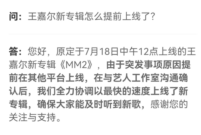 针对此次专辑提前发布一事,网易云音乐客服回复界面新闻时表示:“原定于7月18日中午12点上线的王嘉尔新专辑《MM2》,由于突发事项原因提前在其他平台上线,在与艺人工作室沟通确认后,我们全力协调以最快的速度上线了新专辑,确保大家能及时听到新歌。”