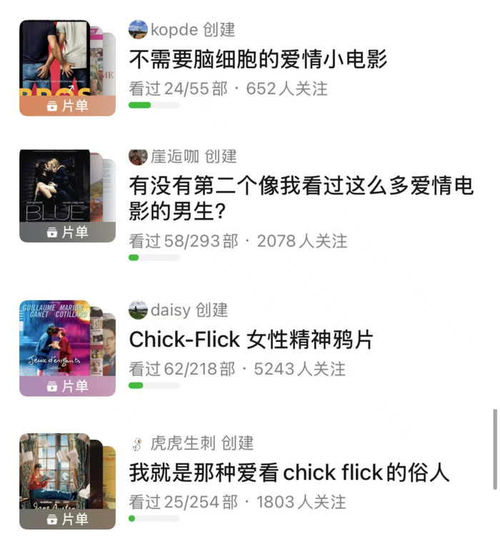 chick一词被沿用至电影分类中,chick flick试图通过贬低性称呼来强化一种观念:涉及女性元素的事物无需被认真对待。苏珊娜·费里斯在《小妞电影:电影中的当代女性》一书中指出,这类电影一方面被视为令人愉悦甚至具有解放意义的娱乐方式,同时也被指责重新强化了女性固有的传统形象。在这一自带贬义的框架内,无论其叙事如何强调“女性胜利”,类型的名称本身仍提醒着我们:它诞生于一个充满性别不对称的话语场中。这似乎是父权制的诡计——小妞电影聚焦女性角色,它允许女性在银幕上追求幸福,却让女性观众为这种追求感到愧疚。网飞曾在2019年发文,指出我们不需要再称呼一部电影为小妞电影(chick flick),除非它真的是关于雏鸡(chick)的电影,并指出这一称呼进一步加剧了“女性观众是浪漫爱情片唯一受众”的刻板印象。在豆瓣,和小妞电影相关的电影豆列被称作“不需要动脑细胞的爱情电影”,这类话语规训无形中加固了浪漫叙事和女性气质之间的刻板关联。