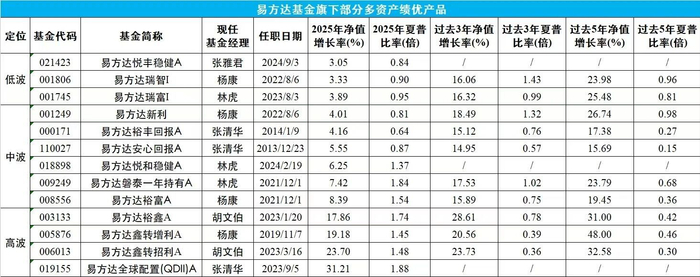 其中,低波产品会严格控制权益资产的暴露比例,对波动率也有严格限制;而中波、高波产品对权益资产的配置有更宽的区间,可利用股票、转债等获取长期显著高于债券的收益。无论是低波、中波还是高波类型,易方达基金均打造出中长期绩优代表产品。