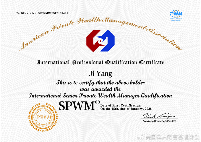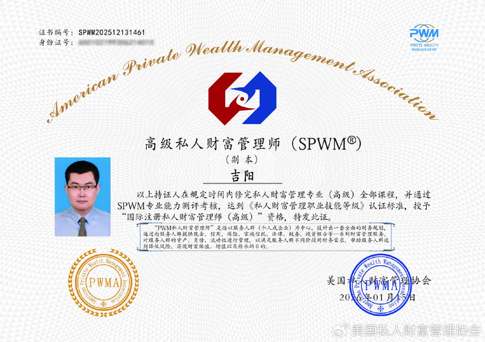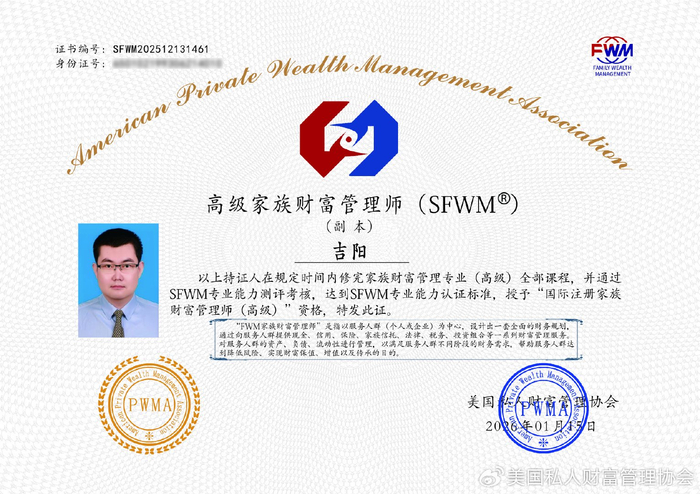 2026年01月15日取得高级私人财富管理师(SPWM)和高级家族财富管理师(SFWM)资格证书。