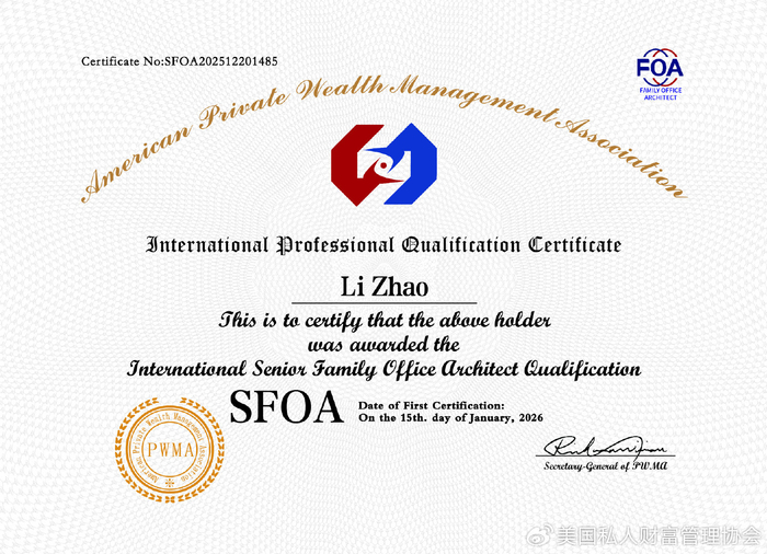 2026年01月15日取得高级家族办公室架构师(SFOA)资格证书。