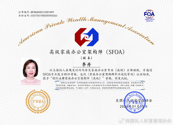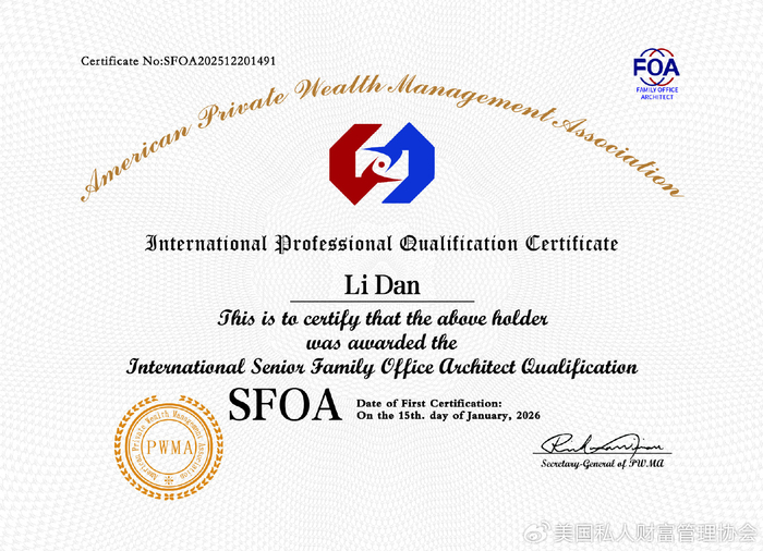“IFOA家族办公室架构师”专业资格,是美国私人财富管理协会为推动《家族办公室架构师职业技能等级》(T/CASME 1598—2024)团体标准落地实施,推出的家族办公室领域专业能力认证项目,是目前国内首个家族办公室从业人员职业技能评价标准,拥有国家职业技能等级标准的家族办公室行业从业资格证书。