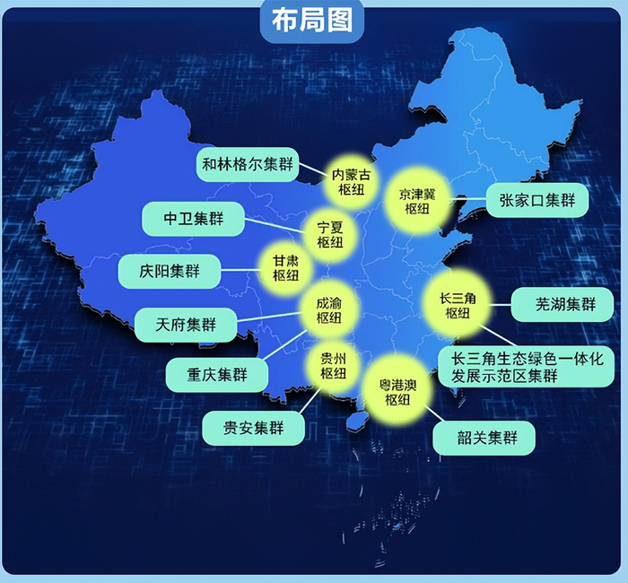 图中的张家口等10个集群,就是8个枢纽节点的承载地。其中长三角有两个集群,成渝有两个集群。