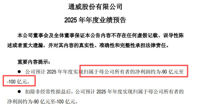 1月18日,通威股份公告称,公司预计2025年年度实现归属于母公司所有者的净利润约为-90亿元至-100亿元。扣除非经常性损益后,公司预计2025年年度实现归属于母公司所有者的净利润约为-90亿元至-100亿元。