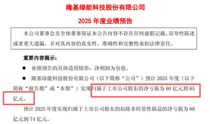 隆基绿能公告称,经财务部门初步测算,预计2025年度实现归属于上市公司股东的净亏损为60亿元到65亿元。预计2025年度实现归属于上市公司股东的扣除非经常性损益的净亏损为68亿元到74亿元。