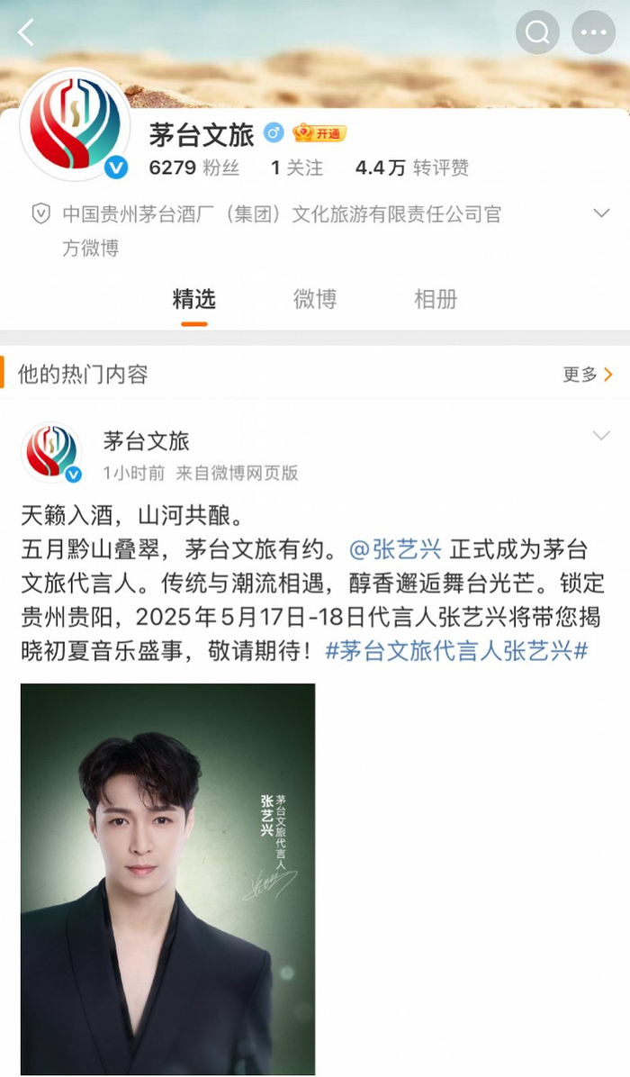 张艺兴已成为茅台文旅的代言人。据了解,在5月17日至18日于贵阳举办的黄小西T²音乐与艺术节上,张艺兴将以茅台文旅代言人身份亮相。