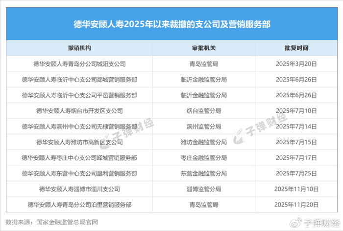 据「子弹财经」不完全统计,截至2025年11月底,德华安顾人寿已获批撤销10家支公司及营销服务部,具体包括青岛分公司城阳支公司、临沂中心支公司郯城营销服务部、烟台开发区支公司、滨州中心支公司无棣营销服务部等。